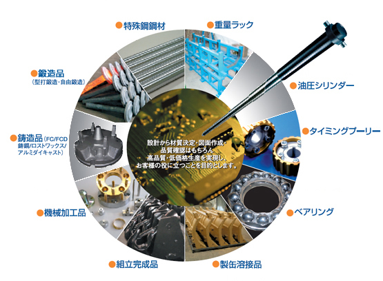 主要取扱アイテム 特殊鋼鋼材 構造用鋼・軸受鋼・ステンレス 非鉄金属 アルミ・真鍮・銅 普通鋼板 厚板(熔断品)・中板・薄板 鍛造品(型打鍛造・自由鍛造) 大型建設用機械から小型鍛造品まで幅広く対応いたします。 強度・耐久性に優れています。 鋳造品(FC / FCD / 鋳鋼) 鋳造から加工完成まで対応いたします。 ロストワックス・アルミダイカスト ロストワックス・アルミダイカストでコストダウンのご提案をいたします。素材から加工完成まで対応いたします。 機械加工品 エアツールを中心にあらゆるお客様へ供給しております。ミクロン単位の加工公差まで対応可能です。 製缶溶接品・組立完成品・製品 製缶から溶接・組立・塗装・まで対応いたします。製品・部品の調達も対応いたします。 空調・換気システム 空調機、換気システムのご提案・据付設置工事をいたします。 テント ワンタッチテントの販売オリジナルデザインの作成の可能です。
