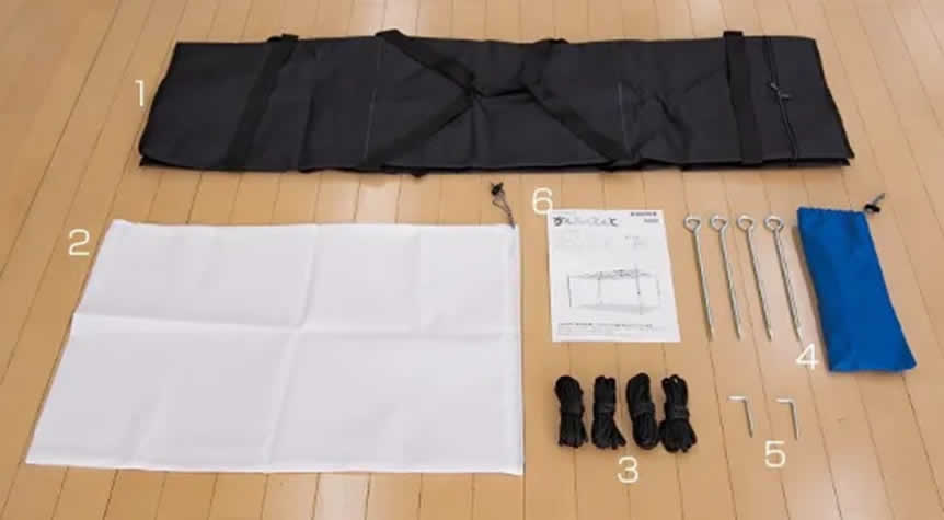 本体収納バッグ/天幕収納袋/ロープ4本/ペグ 4本 or 6本(脚数) /六角レンチ 2本/取扱説明書
